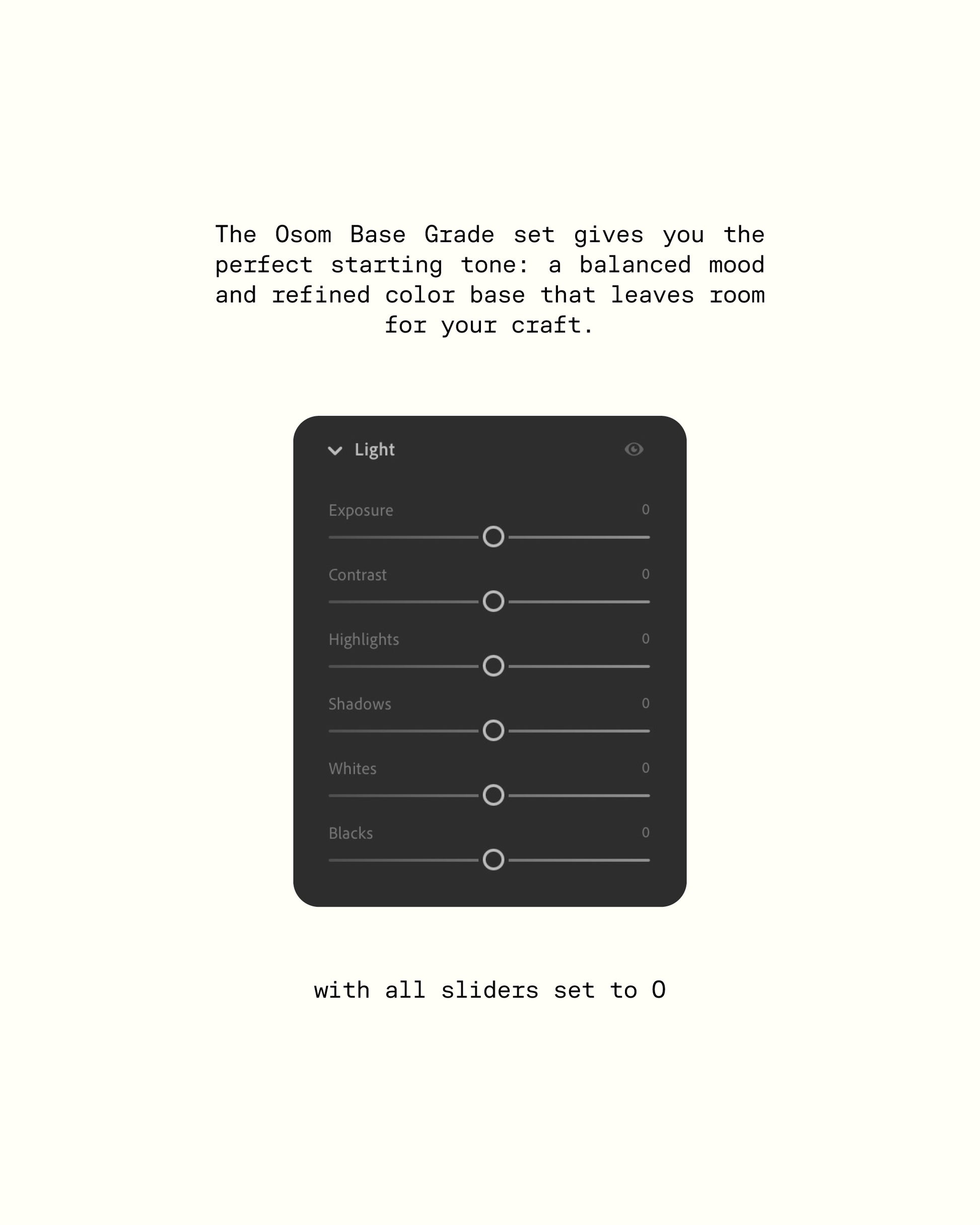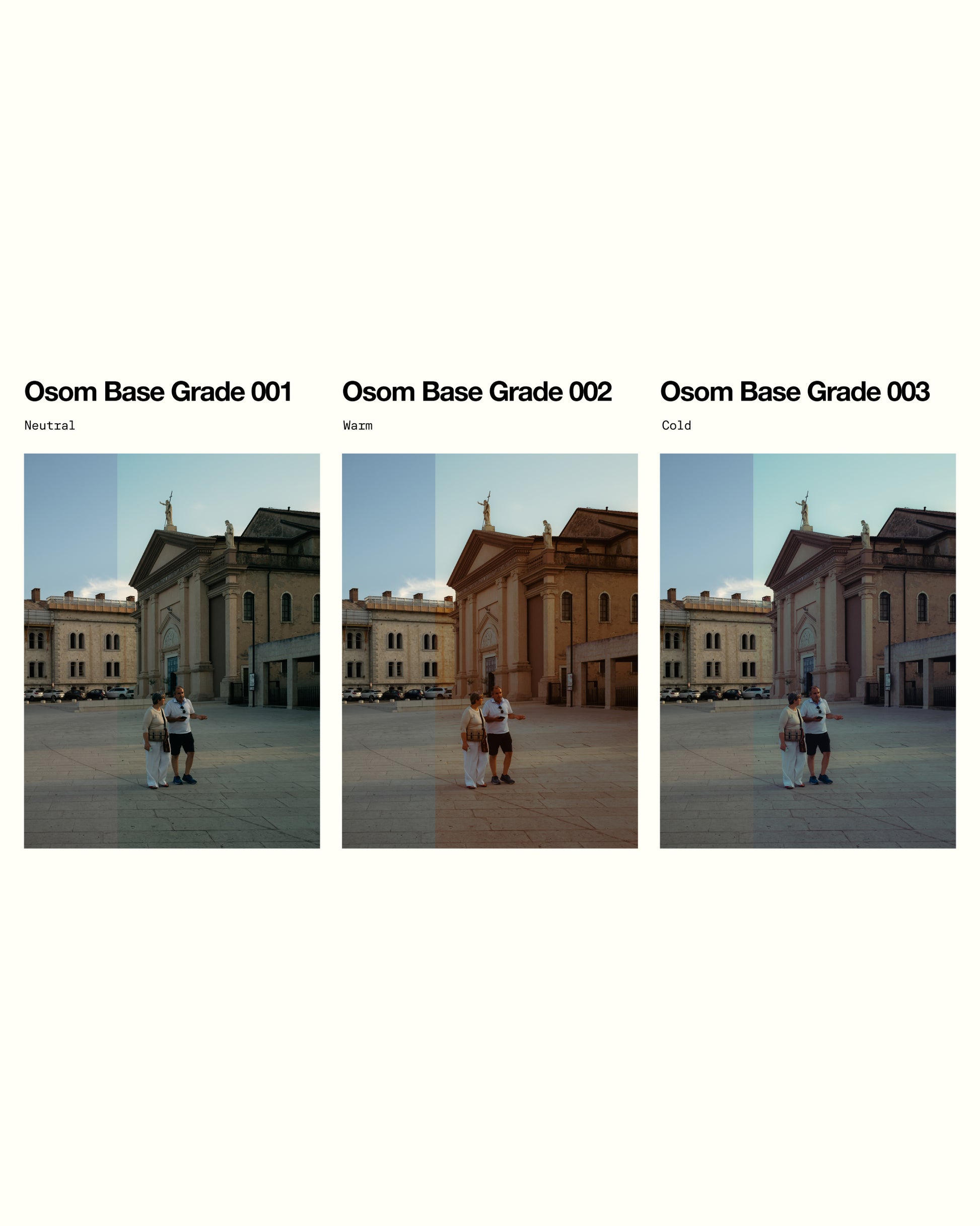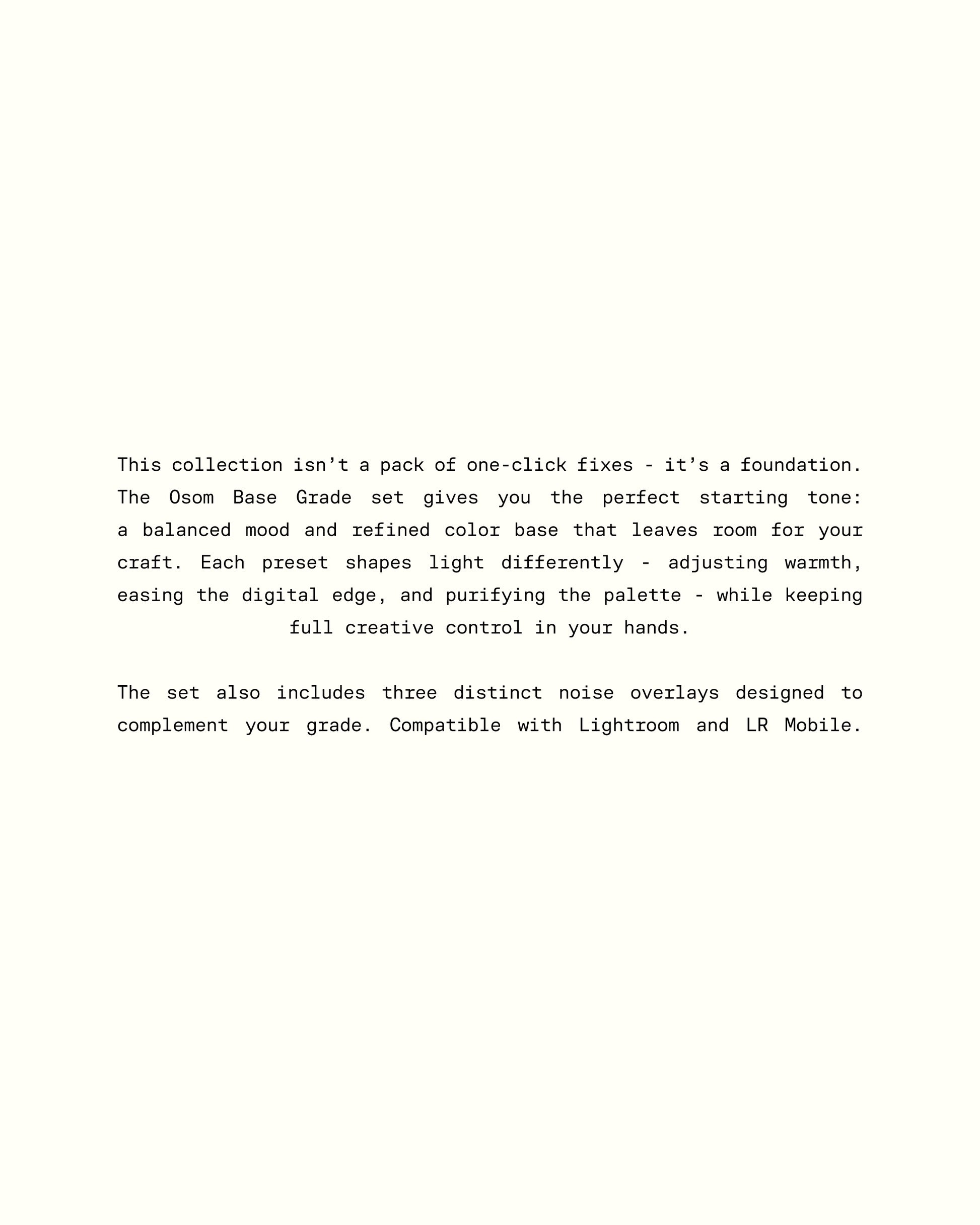 This collection isn’t a pack of one-click fixes - it’s a foundation. The Osom Base Grade set gives you the perfect starting tone: a balanced mood and refined color base that leaves room for your craft. Each preset shapes light differently - adjusting warmth, easing the digital edge, and purifying the palette - while keeping full creative control in your hands. The set also includes three distinct noise overlays designed to complement your grade.